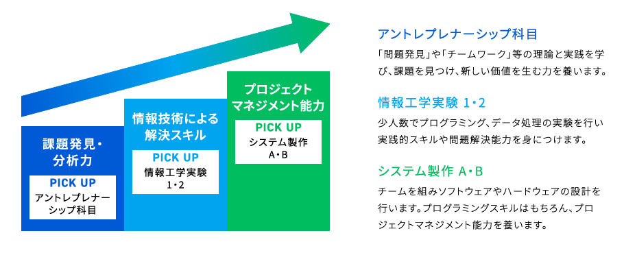 どこに課題があるか、それをどう情報技術で解決するか。そして、具体的な社会実装の方法までを考えることができる実践力を、段階的なカリキュラムで育みます。